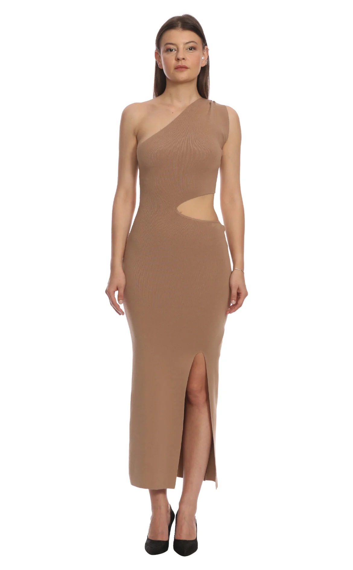 Akep Kahverengi Tek Omuz Asimetrik Yaka Maksi Boy Elbise