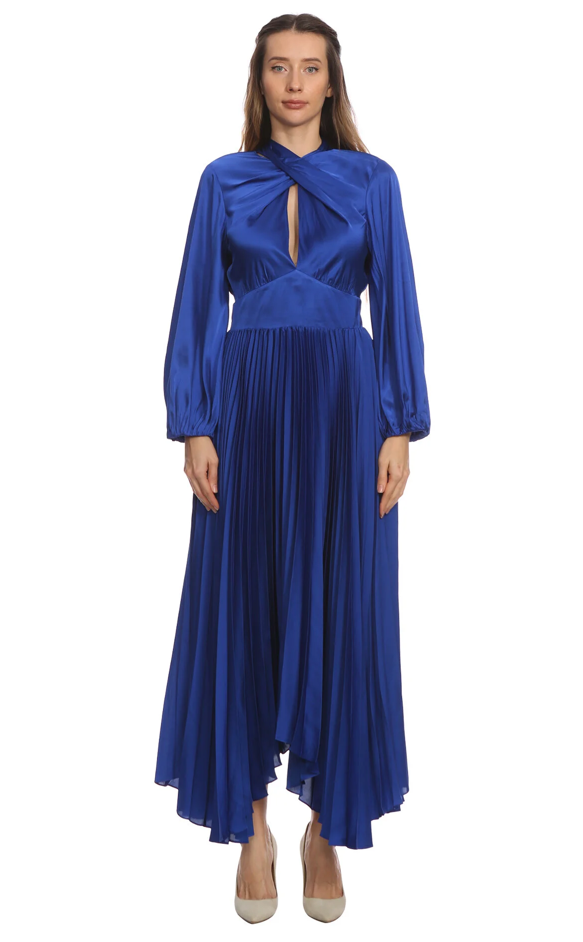 Alice & Olivia Mavi Uzun Kol V Yaka Maksi Boy Elbise