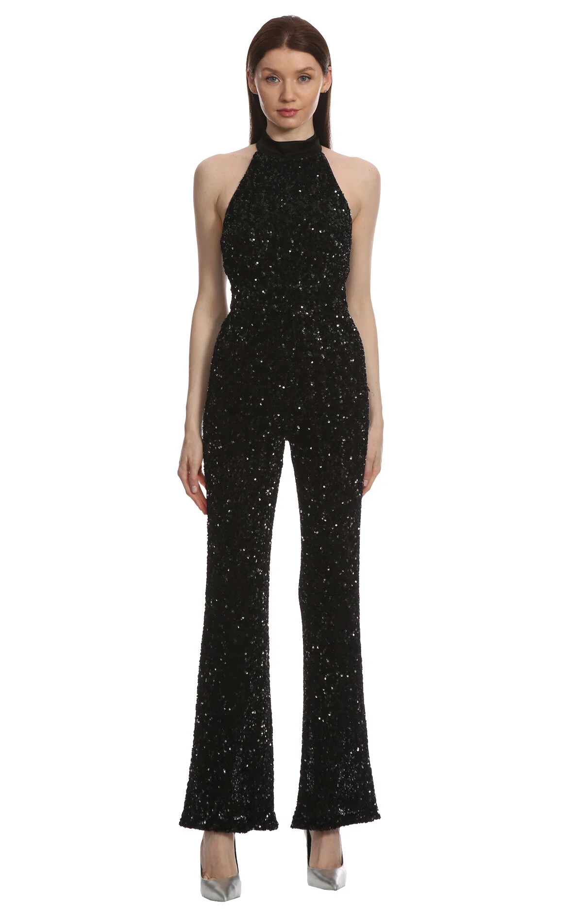 Alice & Olivia Siyah Pul Payet Desenli Kolsuz Bisiklet Yaka Tulum