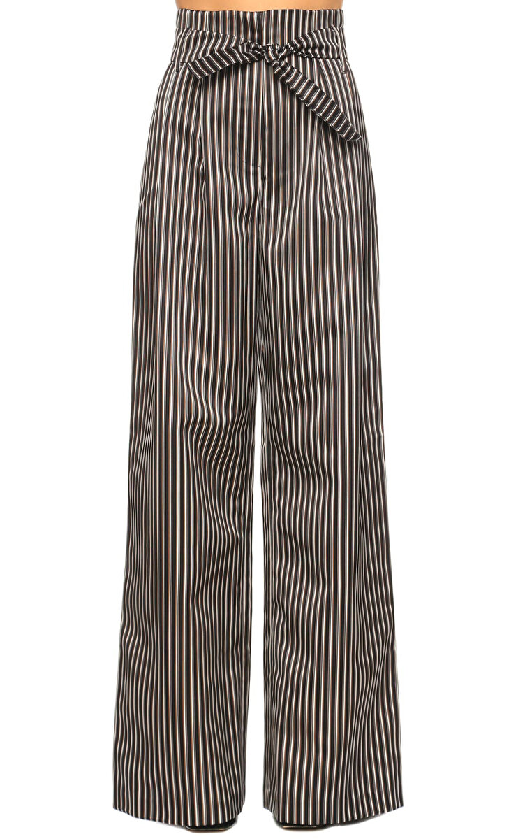 Yüksek bel, cepli, çizgi desenli, belden bağlama detaylı, geniş paça, siyah Amur pantolon
