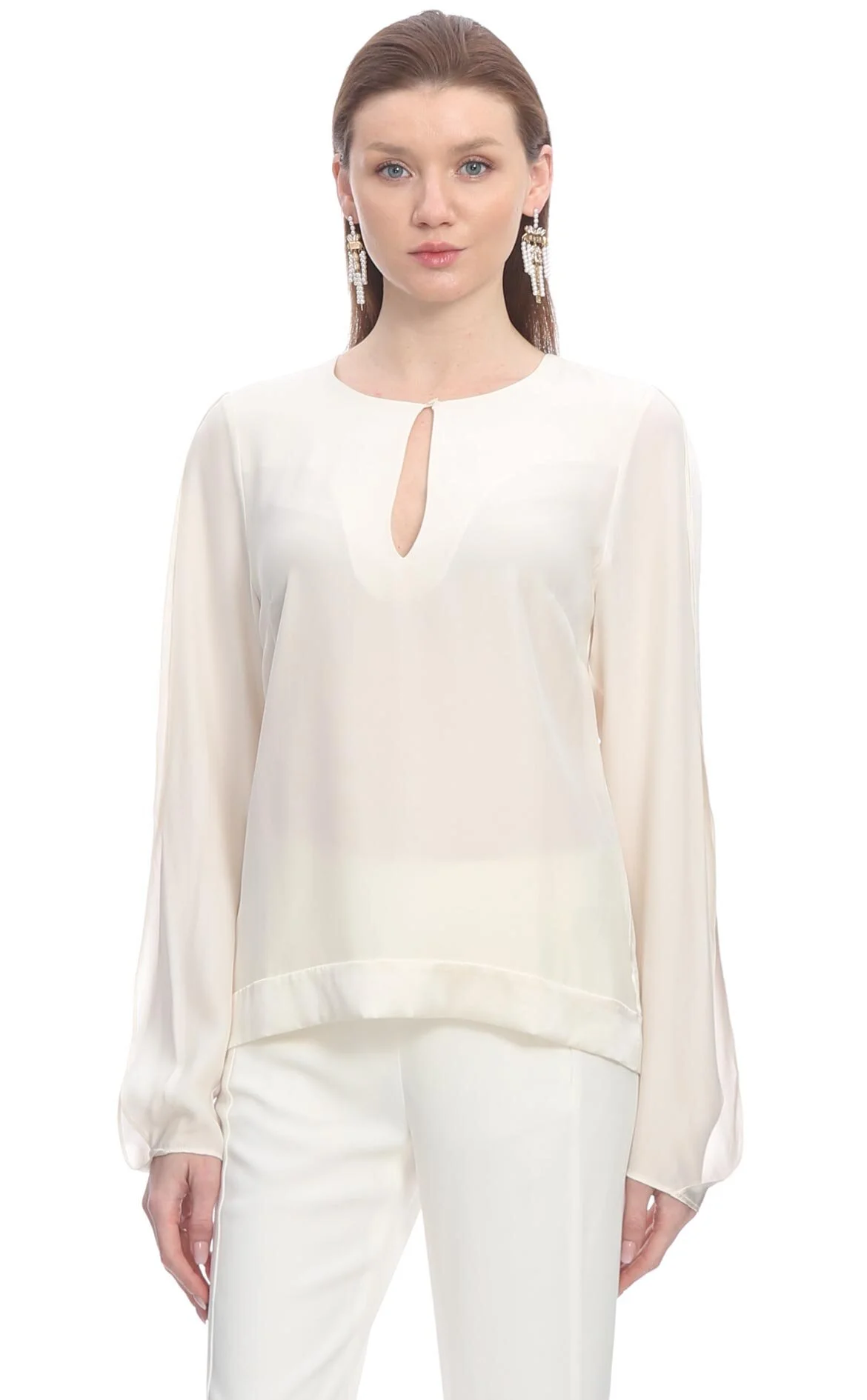 3. Beyaz Uzun Kol Düğmeli Yaka Saten Bluz