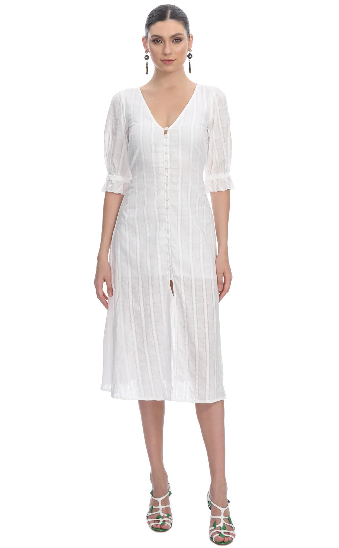 Bec and Bridge Beyaz Delikli Desenli Yarım Kol V Yaka Pamuk Midi Boy Elbise