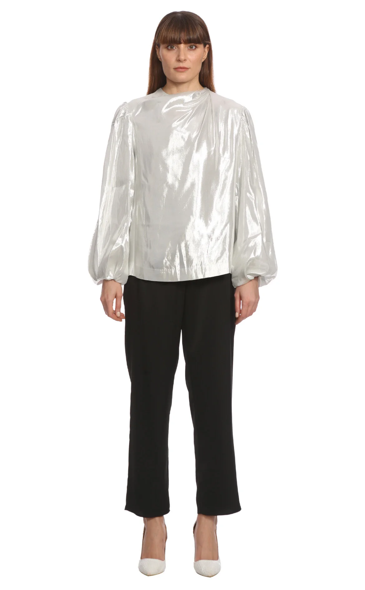 By Malina Gri Balon Kol Yuvarlak Yaka İpek Karışımlı Gömlek