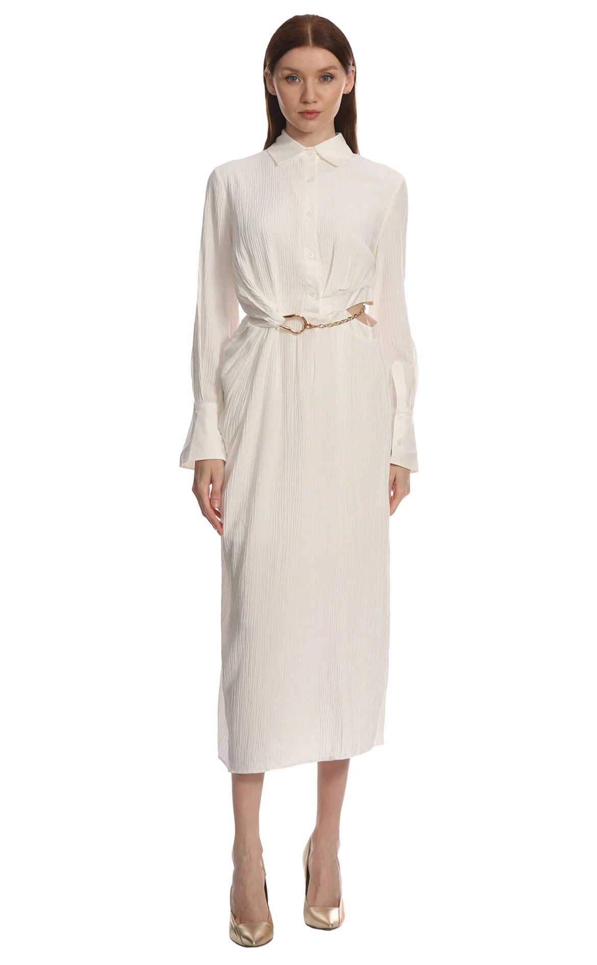 Cedelar Beyaz Uzun Kol Gömlek Yaka Maksi Boy Elbise