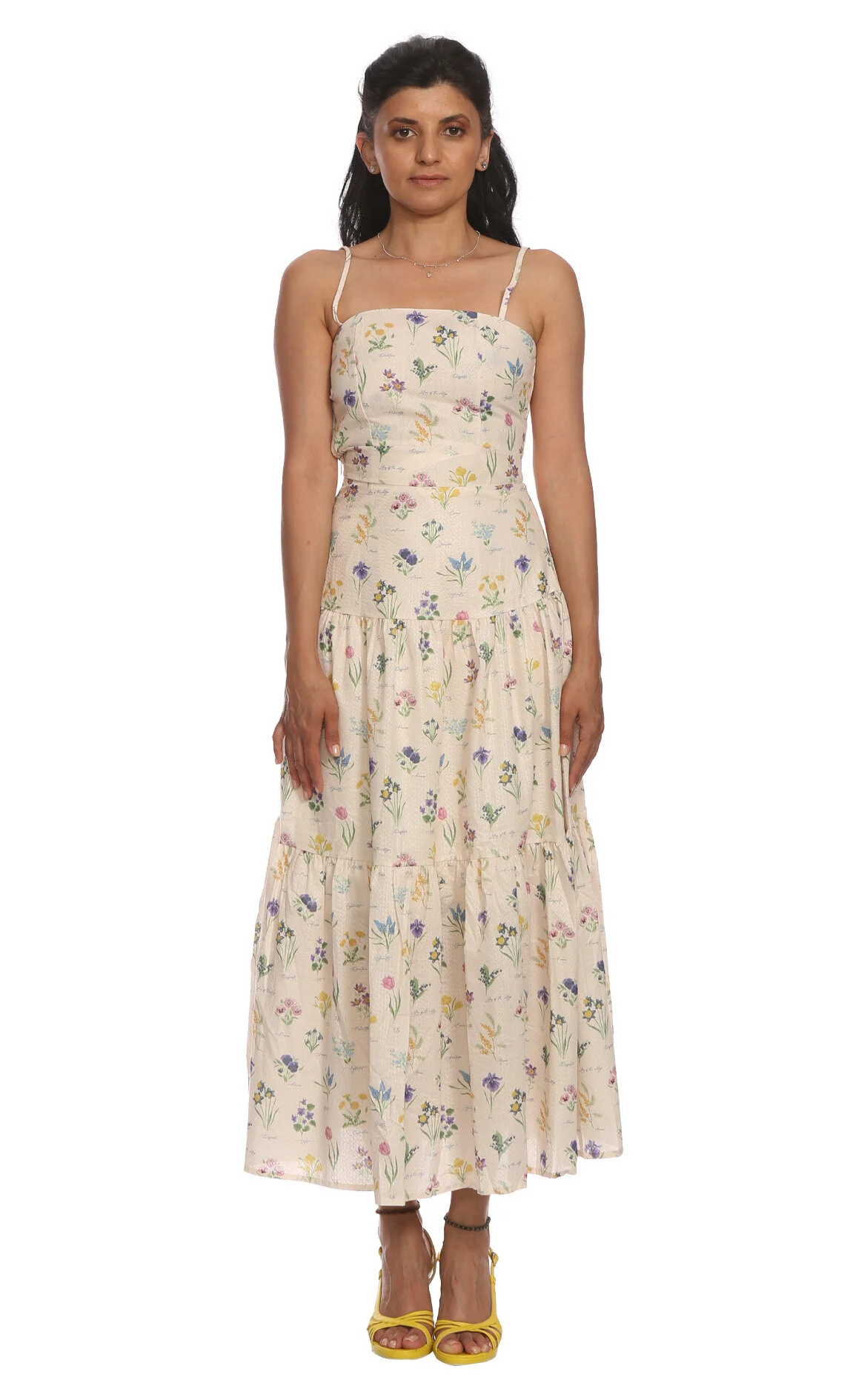 4. Bej Çiçek Desenli Askılı Kare Yaka Midi Boy Elbise