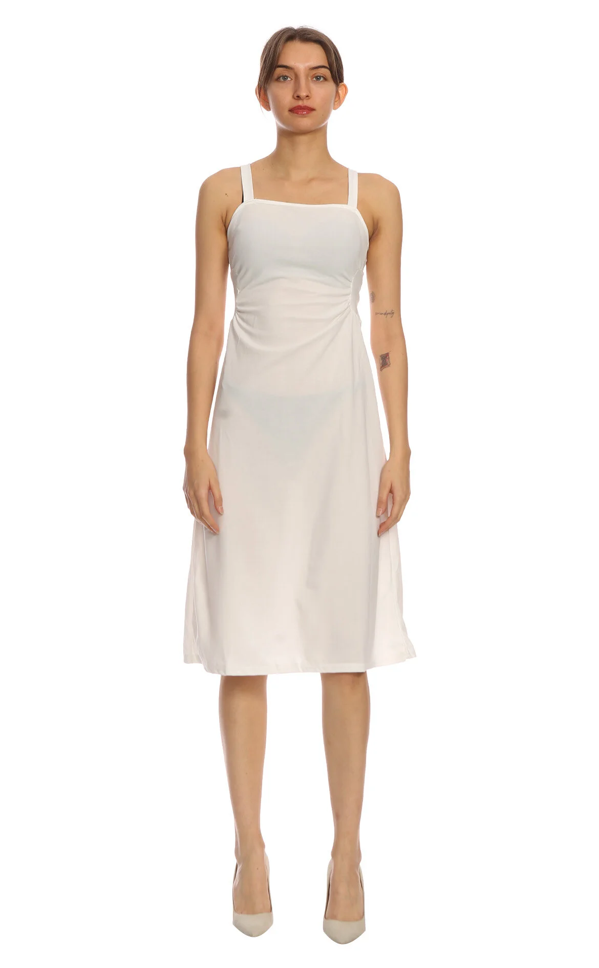 5. Beyaz Büzgü Detaylı Askılı Kare Yaka Midi Boy Elbise