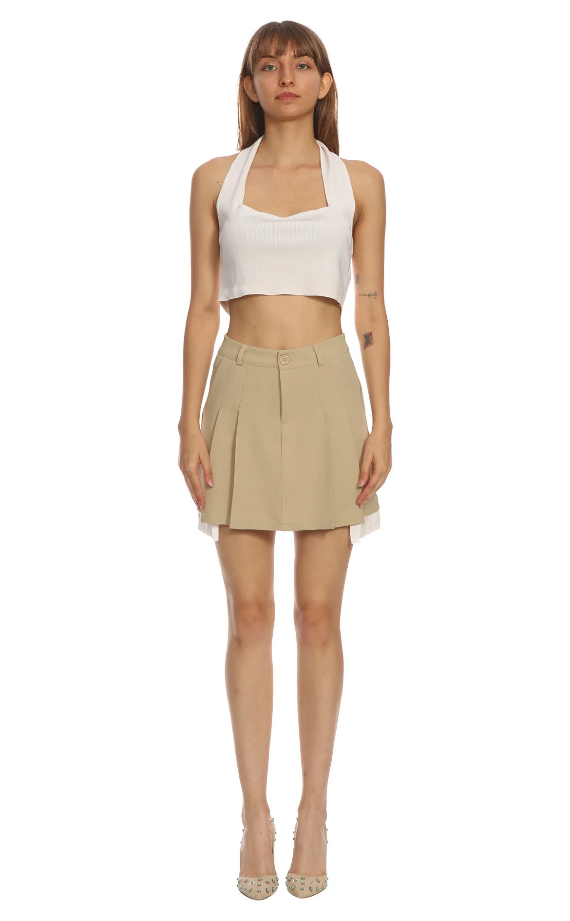 3. Bej Pileli Normal Bel Mini Etek