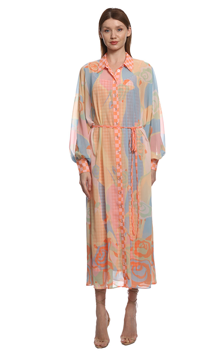 Gömlek yakalı, balon kollu, çiçek desenli, beli bağcıklı, iç astarlı, uzun, renkli Cmeo elbise