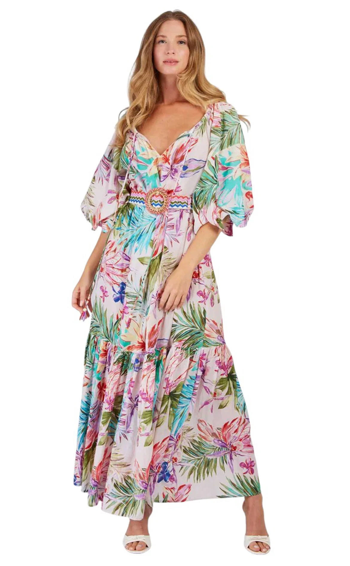 3. Çok Renkli Karışık Desenli Kısa Kollu V Yaka Midi Boy Elbise