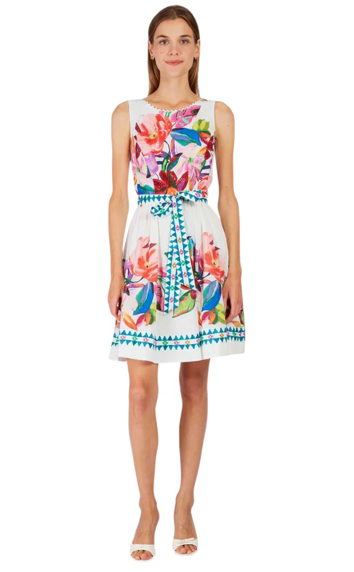 Derhy Çok Renkli Çiçek Desenli Kolsuz Oval Yaka Mini Boy Elbise
