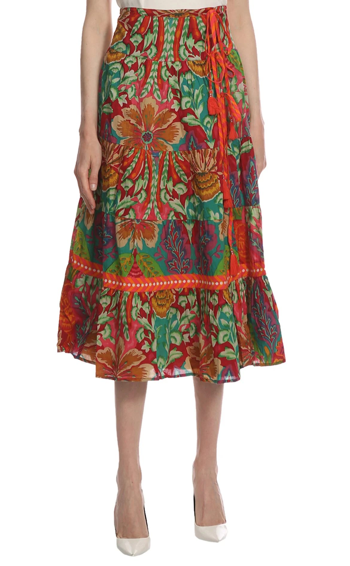 Derhy Kırmızı Çiçek Desenli Normal Bel Midi Etek
