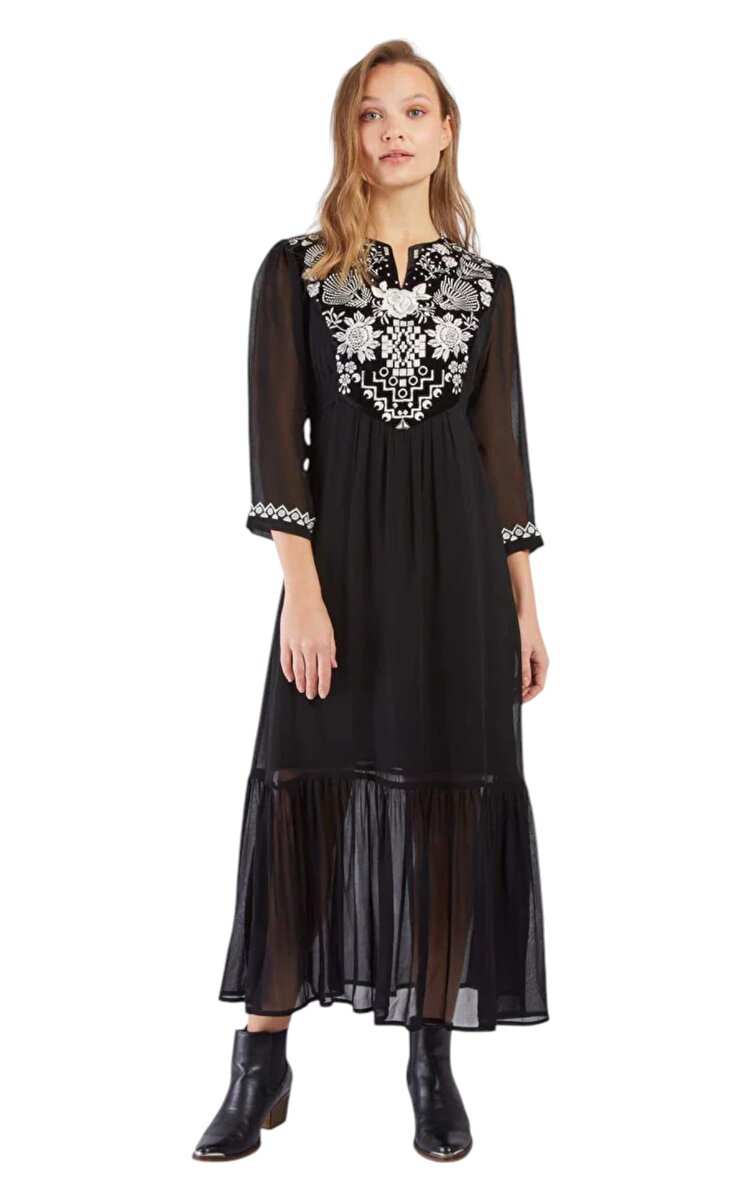 V yakalı, uzun kollu, karma desenli, midi boy, siyah Derhy elbise