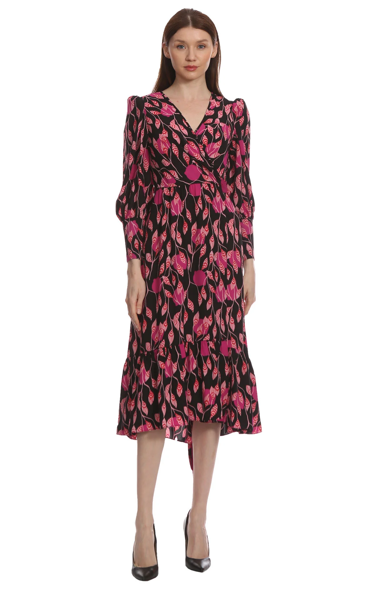 Diane Von Furstenberg Çok Renkli Çiçek Desenli Uzun Kol Kruvaze Yaka Midi Boy Elbise