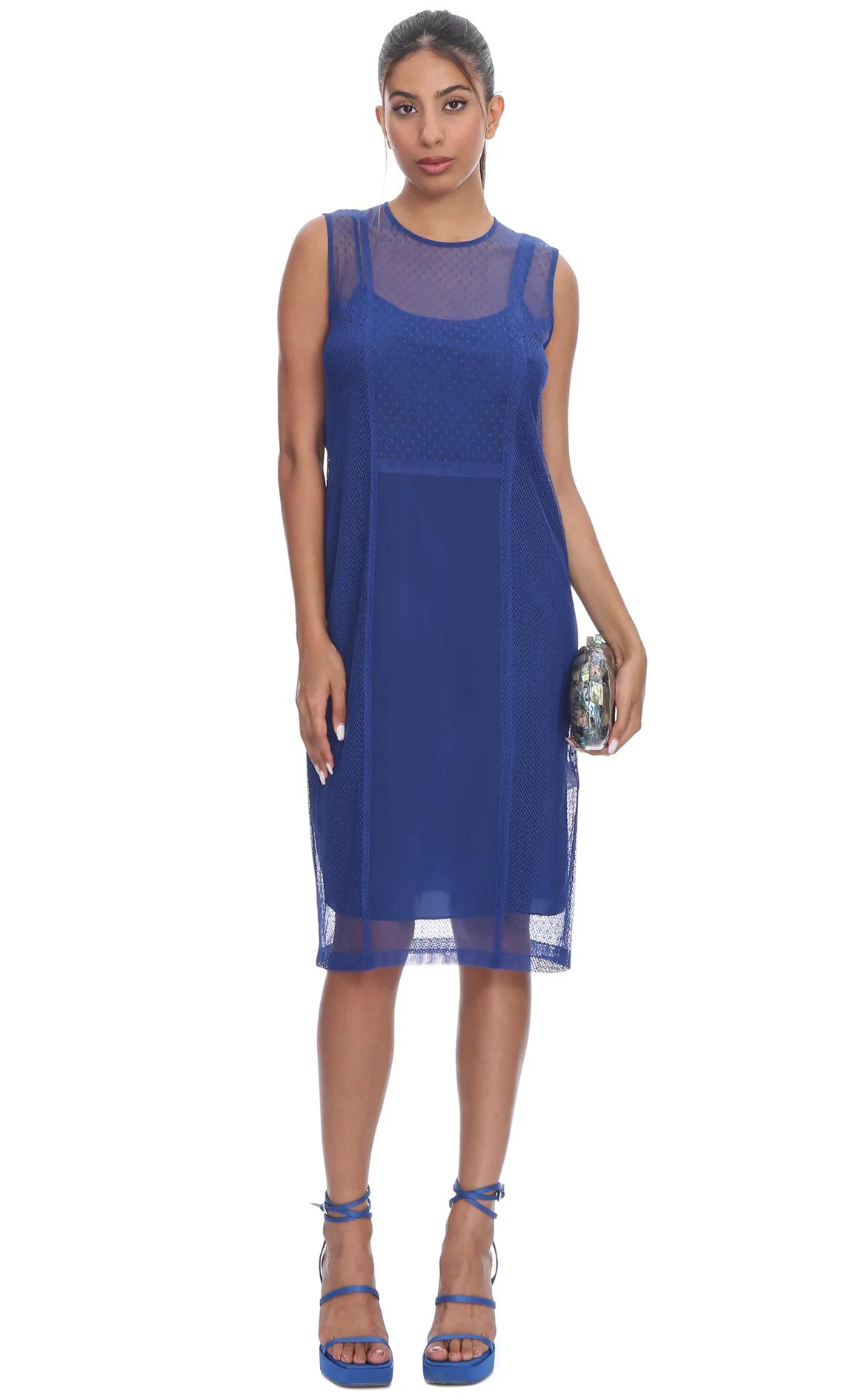 3. Lacivert Delikli Desenli Kolsuz Sıfır Yaka Pamuklu Midi Boy Elbise