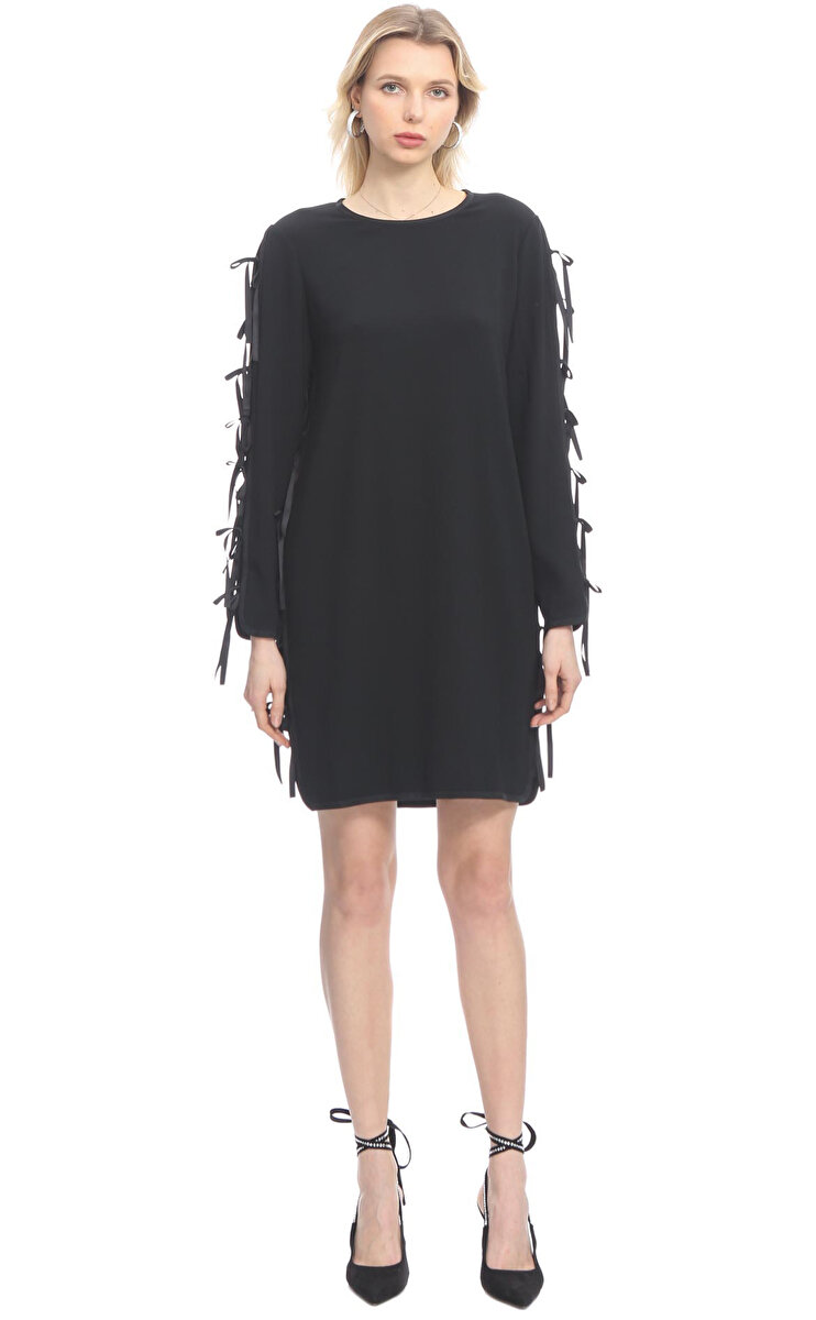Sıfır yakalı, uzun kollu, diz üstü, düz desenli, kolları kurdele detaylı, siyah DKNY elbise