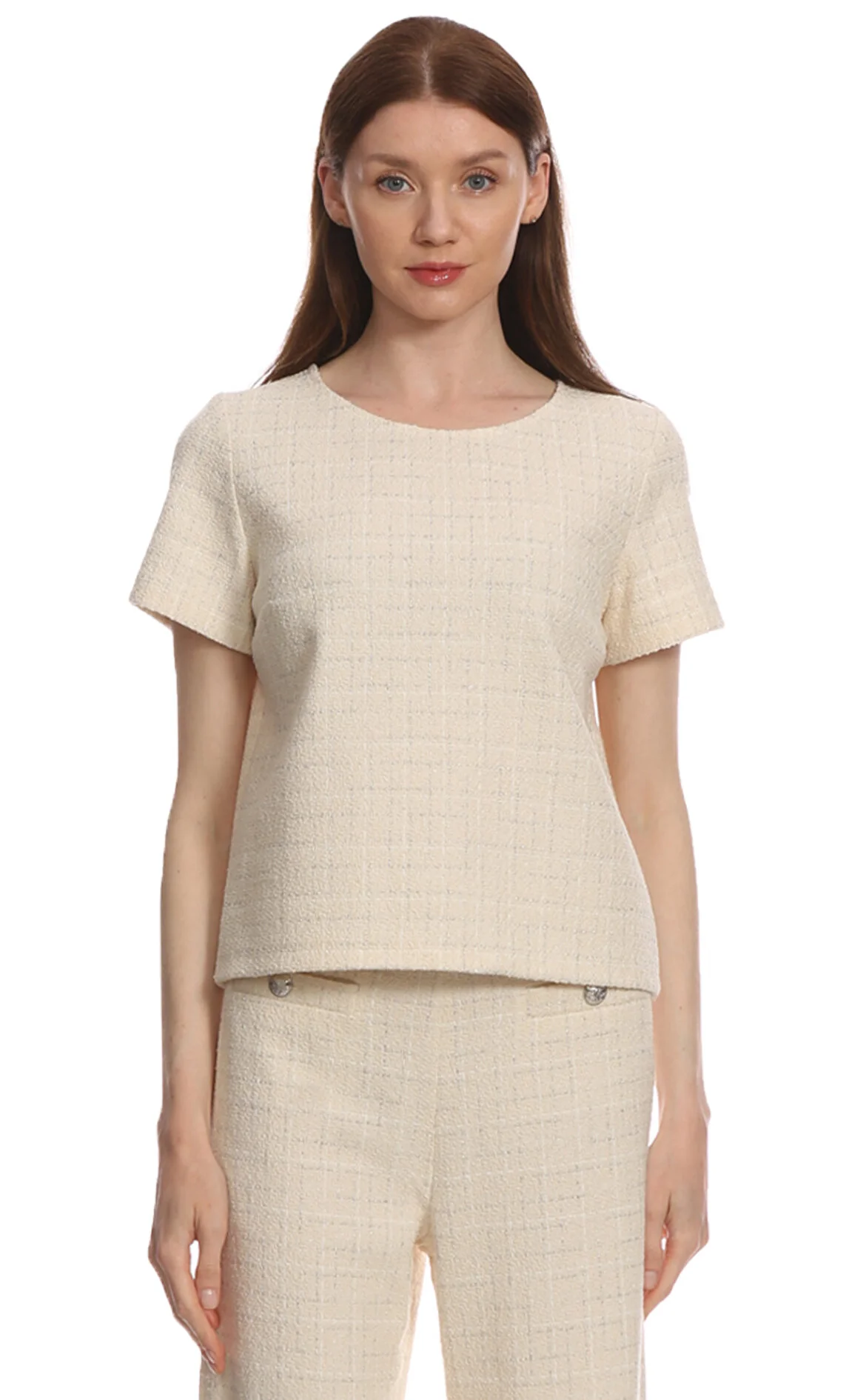3. Ekru Kare Desenli Kısa Kol Yuvarlak Yaka Pamuklu Bluz