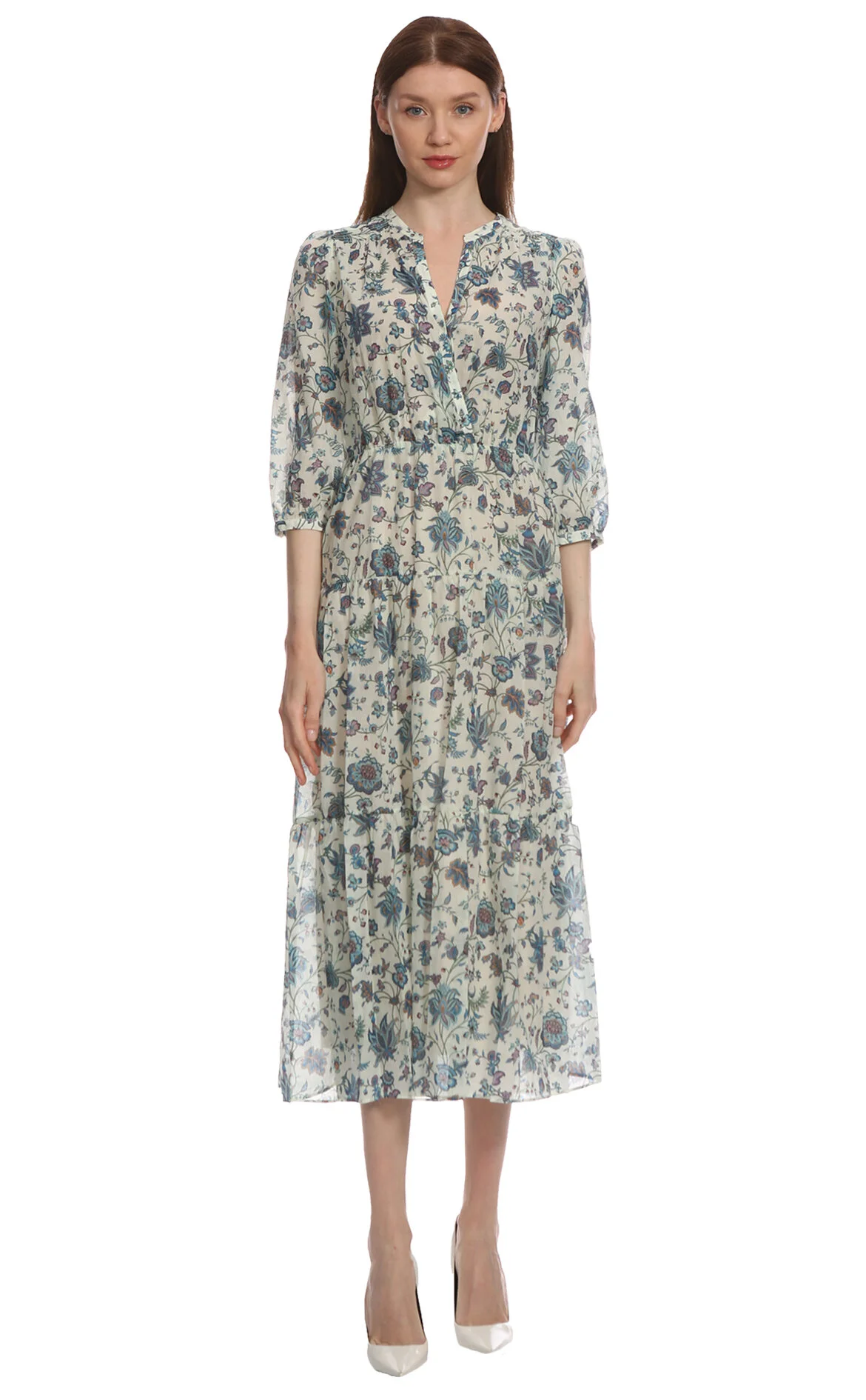 3. Ekru Çiçek Desenli Kısa Kollu V Yaka Pamuk Midi Boy Elbise