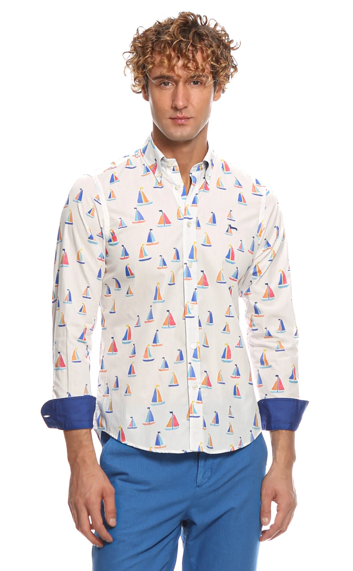 Harmont & Blaine Beyaz Gemi Desenli Uzun Kol Pamuk Gömlek