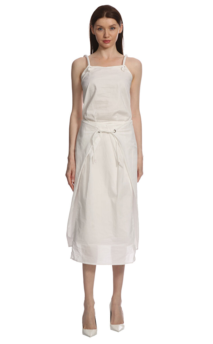 Kare yakalı, askılı kollu, bağlama detaylı, metal ayrıntılı, midi boylu, beyaz İxos elbise