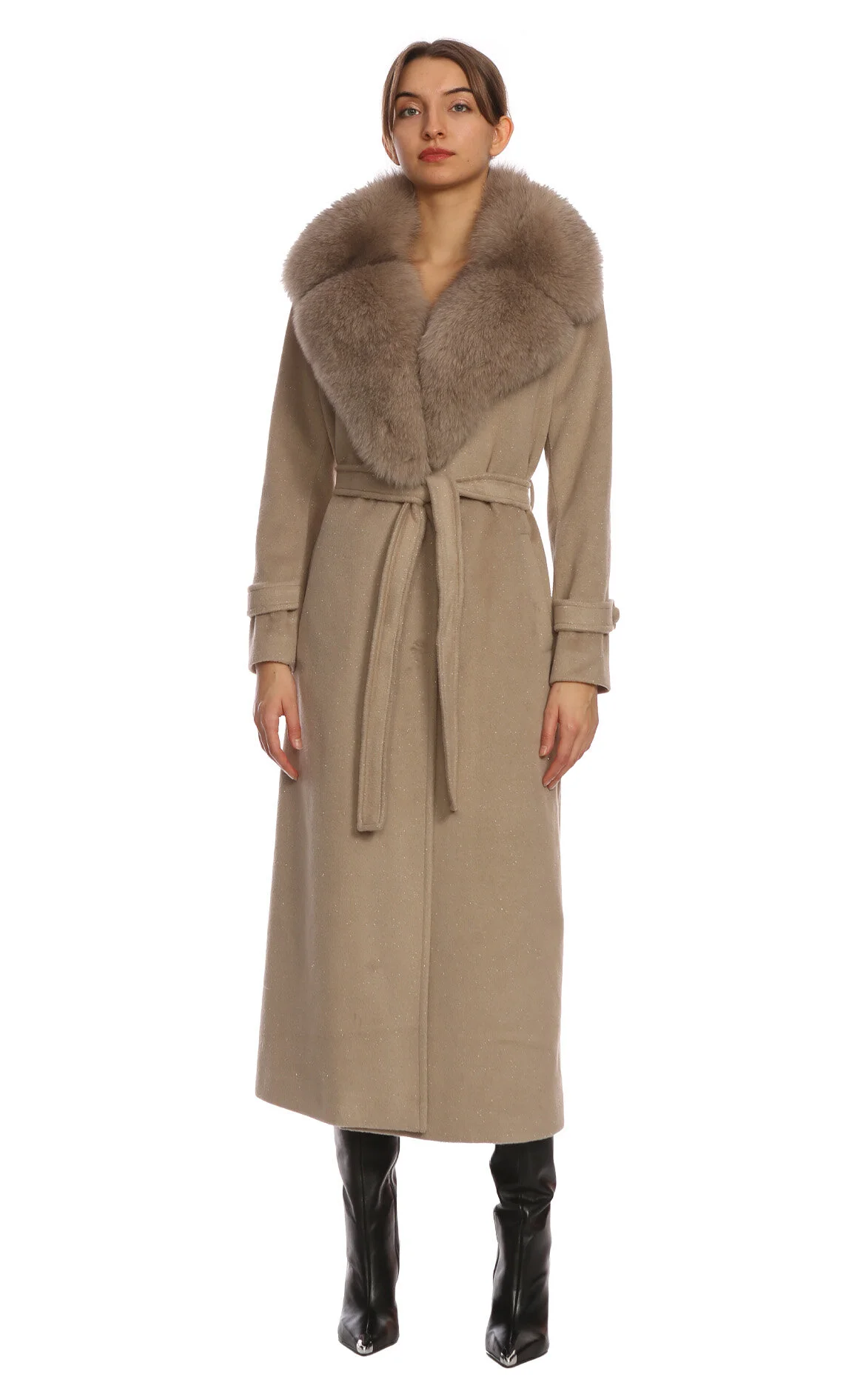 Jamila Sarah Bej Düz Desen Kürk Yaka Kaban