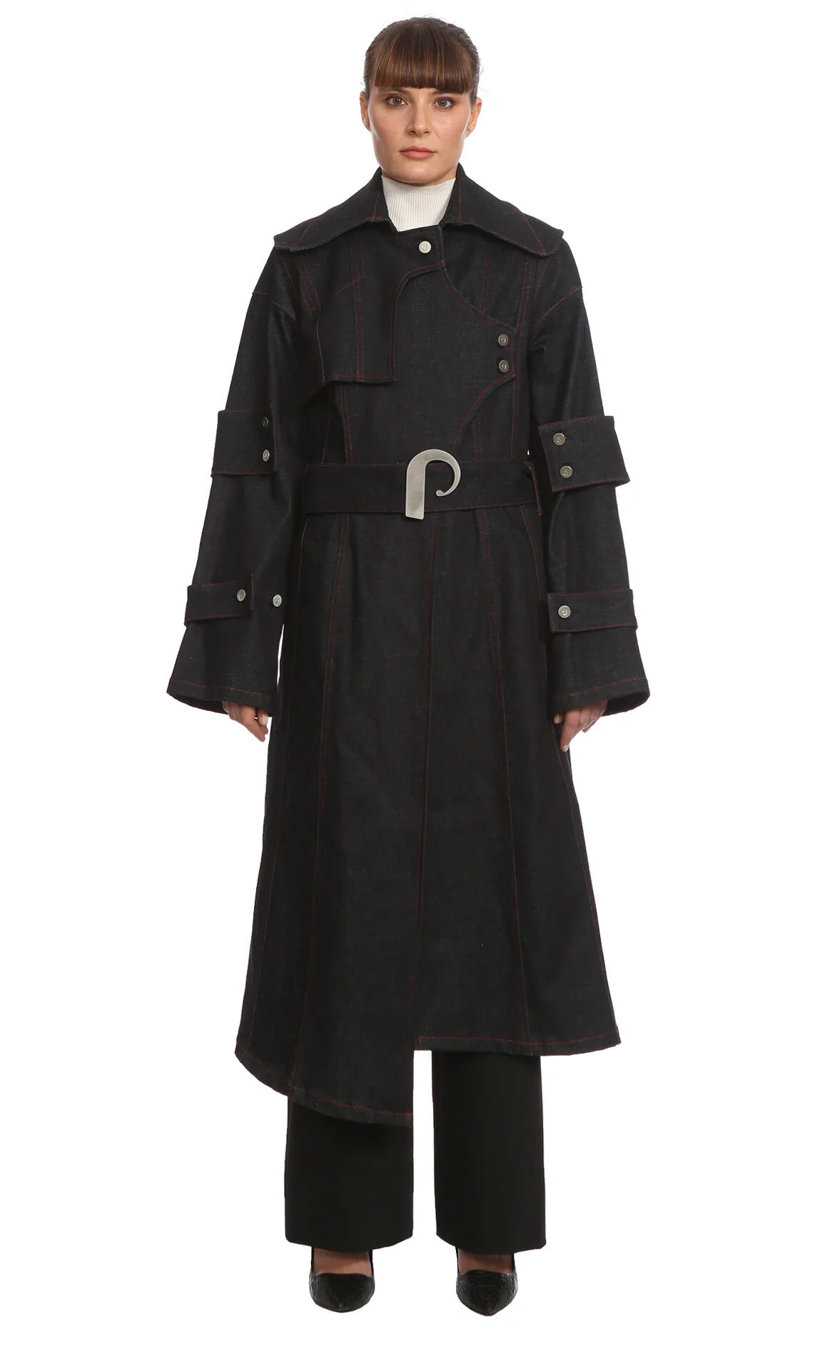 Jendue Lacivert Uzun Kol Pelerin Yaka Jean Trençkot
