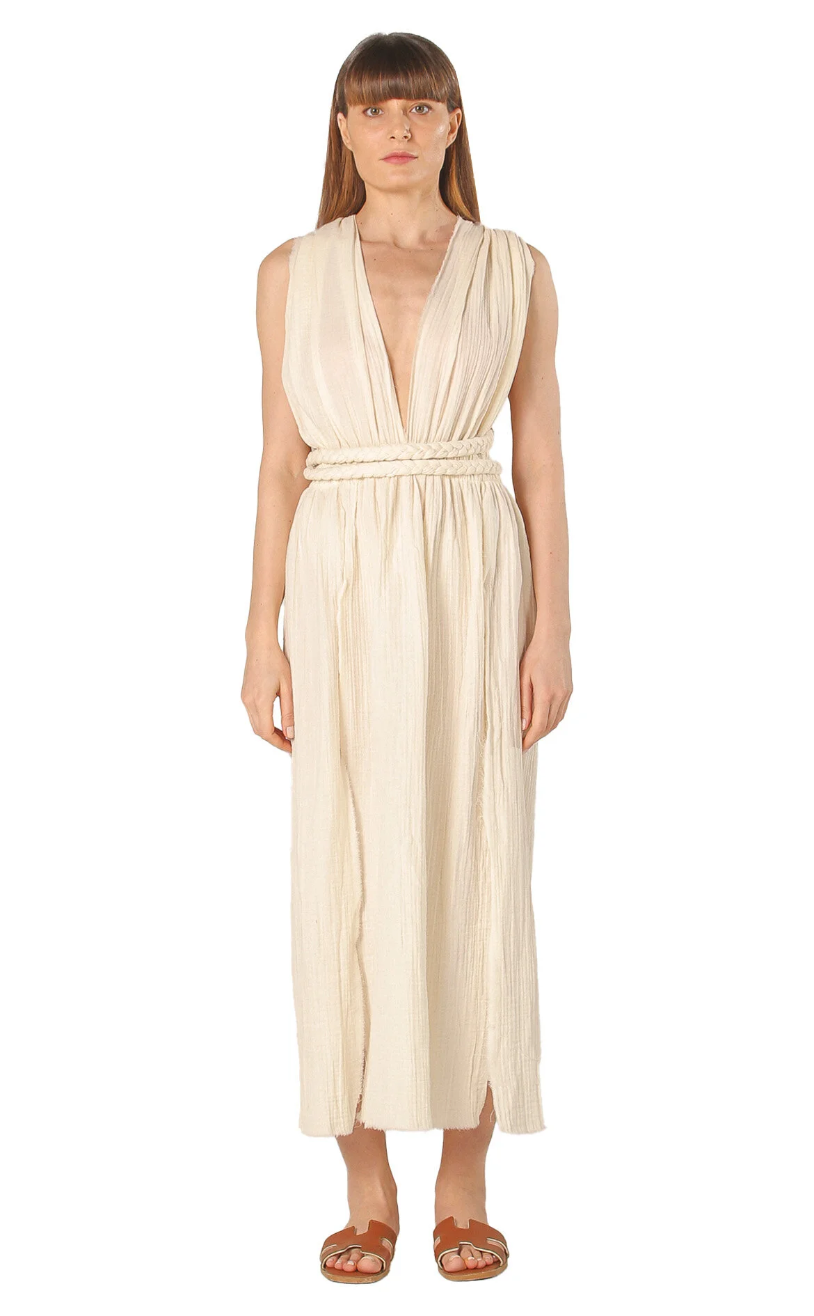 4. Ekru Askılı V Yaka Pamuk Midi Boy Elbise