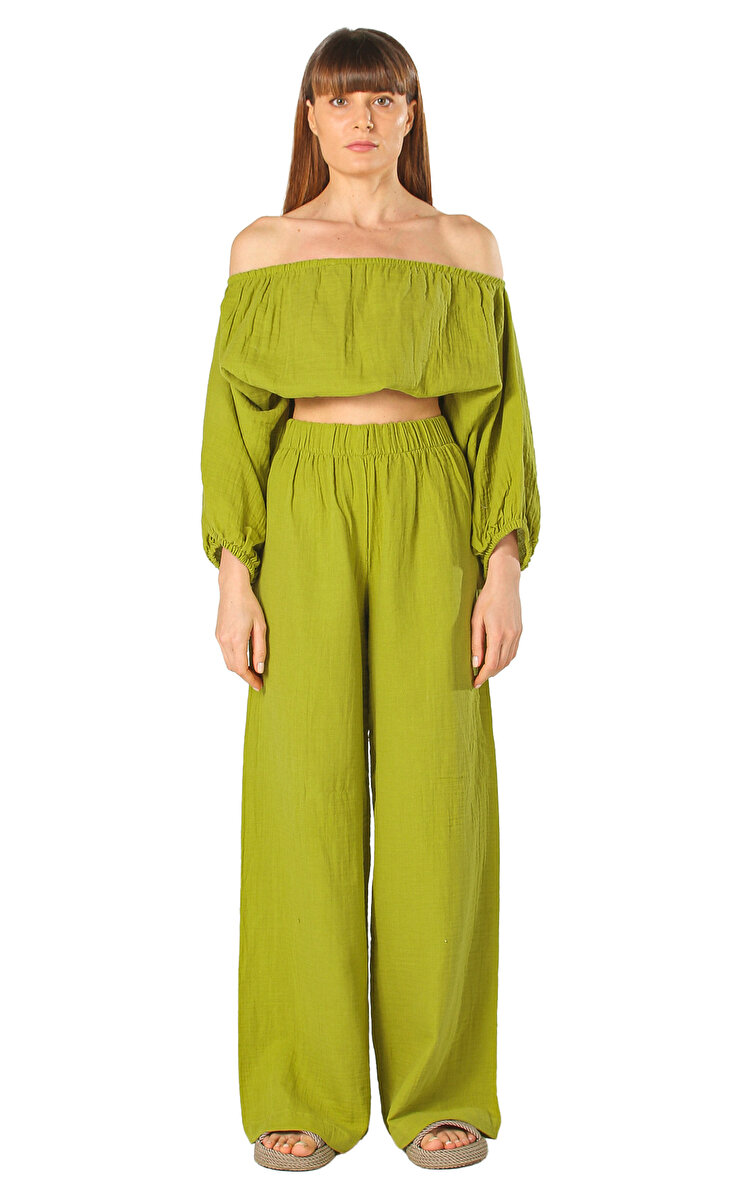 Straplez yakalı, uzun kollu, düz desenli, normal belli, bol paçalı, yeşil Jessywell takım