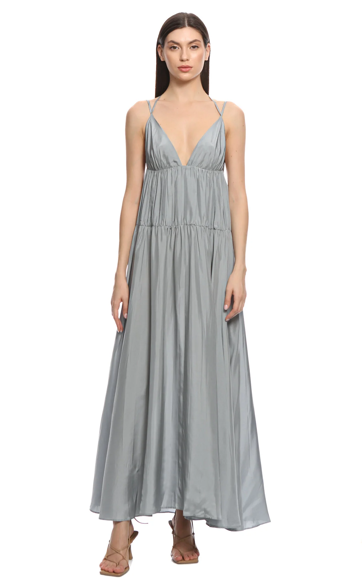 5. Gri Askılı Deriv V Yaka İpek Maksi Boy Elbise