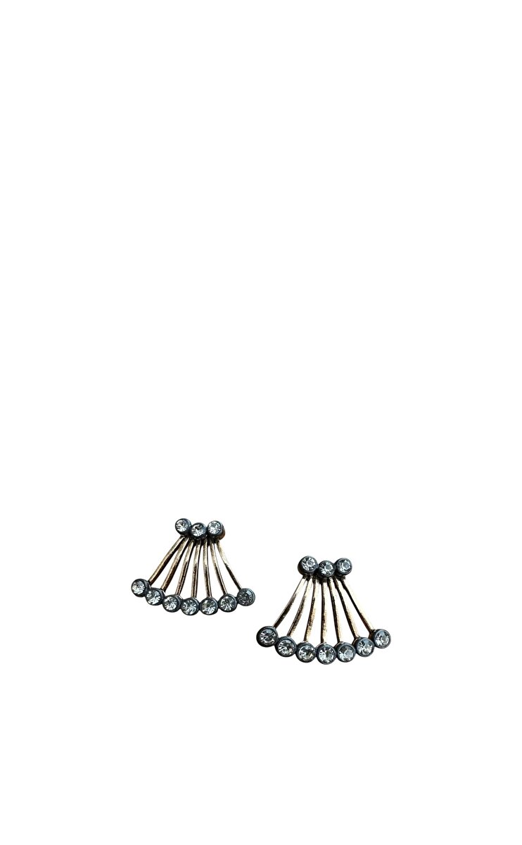 Işık Yelpazesi küpeler, zarafetin mimarisinden ilham alır. Beş radyal metal kol, bir yelpaze gibi açılarak hareketin ve ışığın simetrisini yakalar. Her kolun ucunda yer alan parlak taşlar, adeta bir yıldız gibi parıldar. Üst kısımda yer alan üçlü taş dizilimi ise tasarıma dengeli bir ışıltı ekler. Bu küpeler, hem modern hem de nostaljik bir etki yaratır; geçmişin zarafetini bugünün çizgileriyle buluşturur.