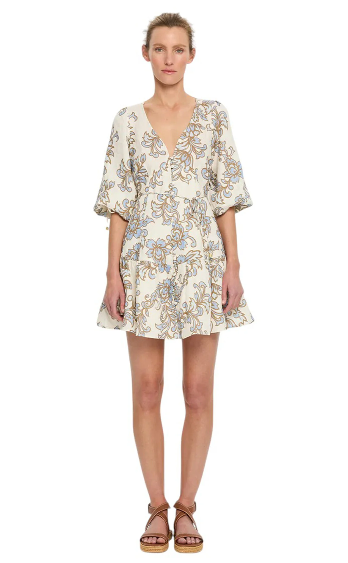 Kivari Çok Renkli Karışık Desenli Yarım Kol Deriv V Yaka Keten Karışımı Mini Boy Elbise