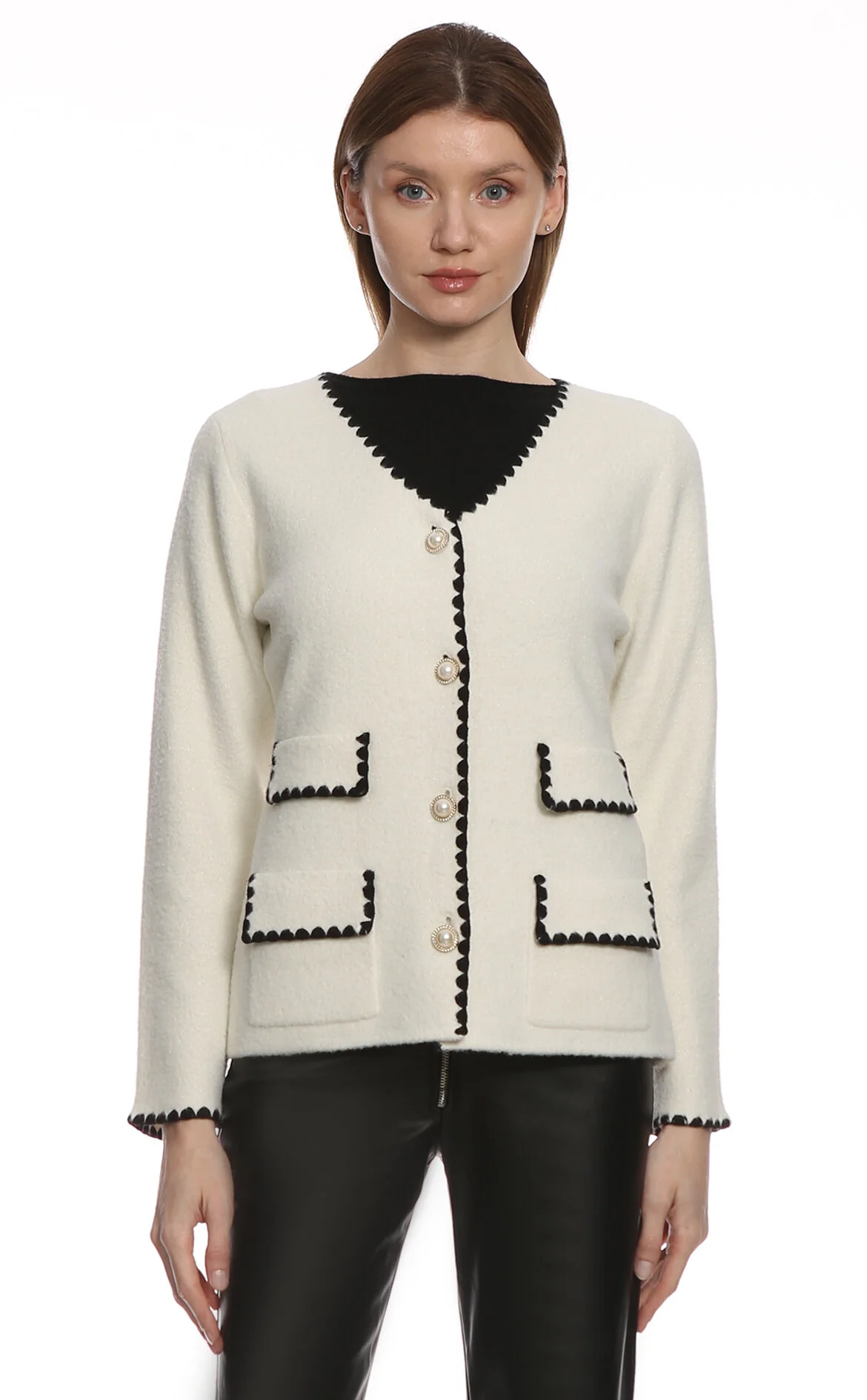 3. Siyah/Beyaz Simli Uzun Kollu Yuvarlak Yakalı Hırka