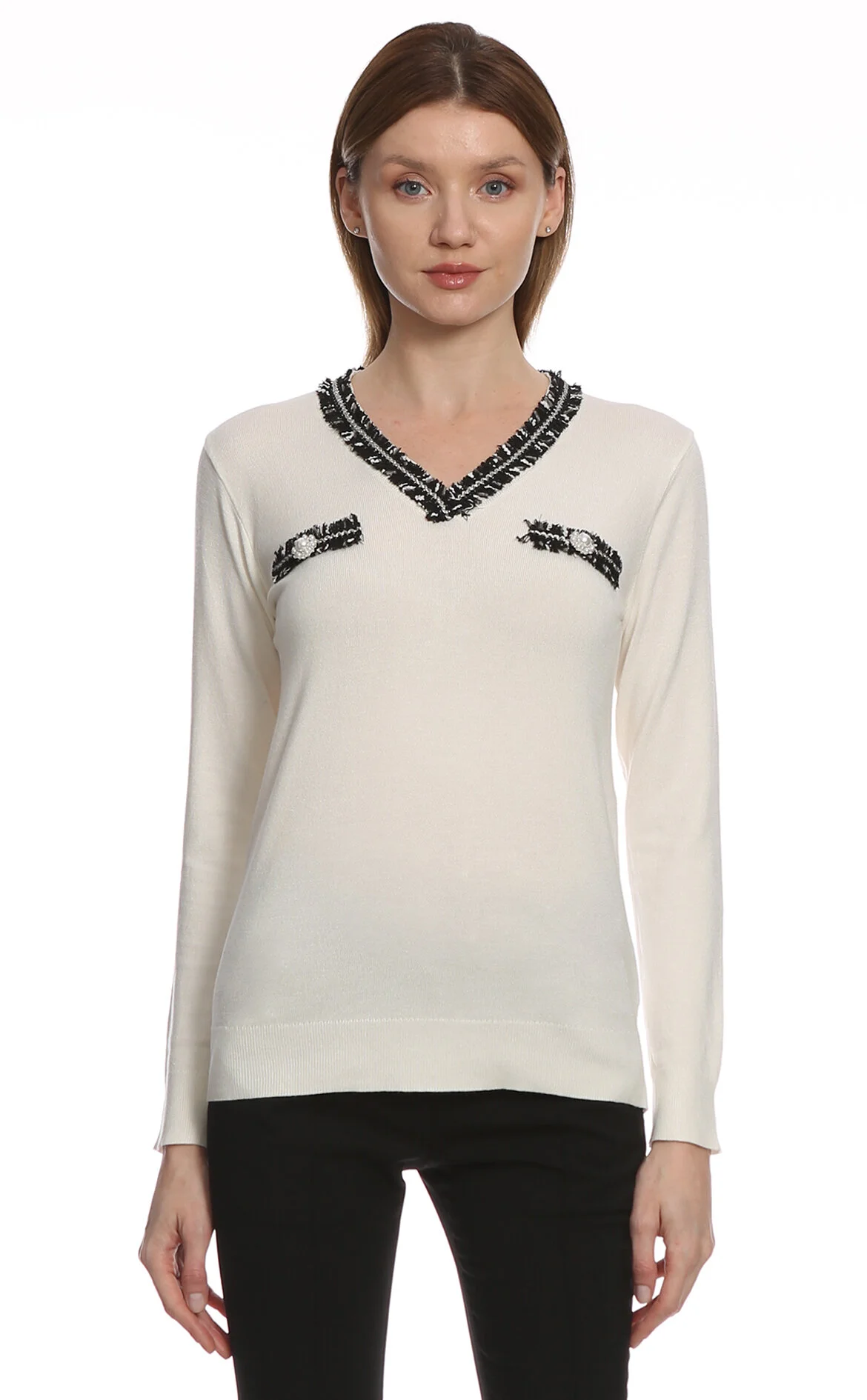 3. Beyaz Uzun Kol V Yaka Kazak