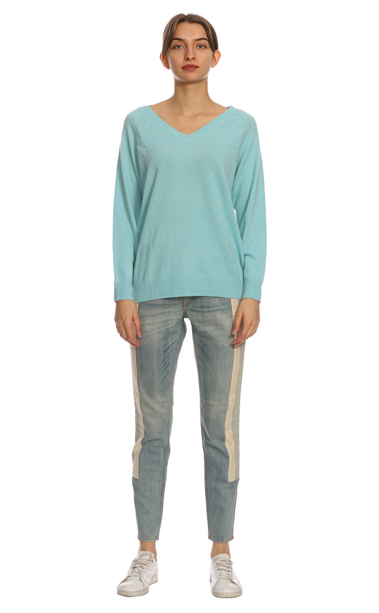 V yakalı, uzun kollu, düz desenli, turkuaz Leo & Ugo kazak