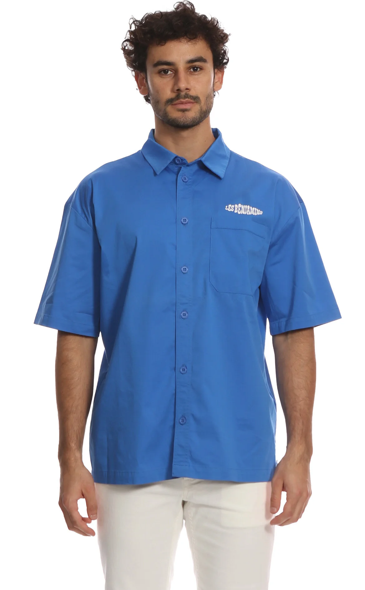 Les Benjamins Saks Mavisi Düz Desenli Oversize Fit Kısa Tek Cepli Pamuk Gömlek