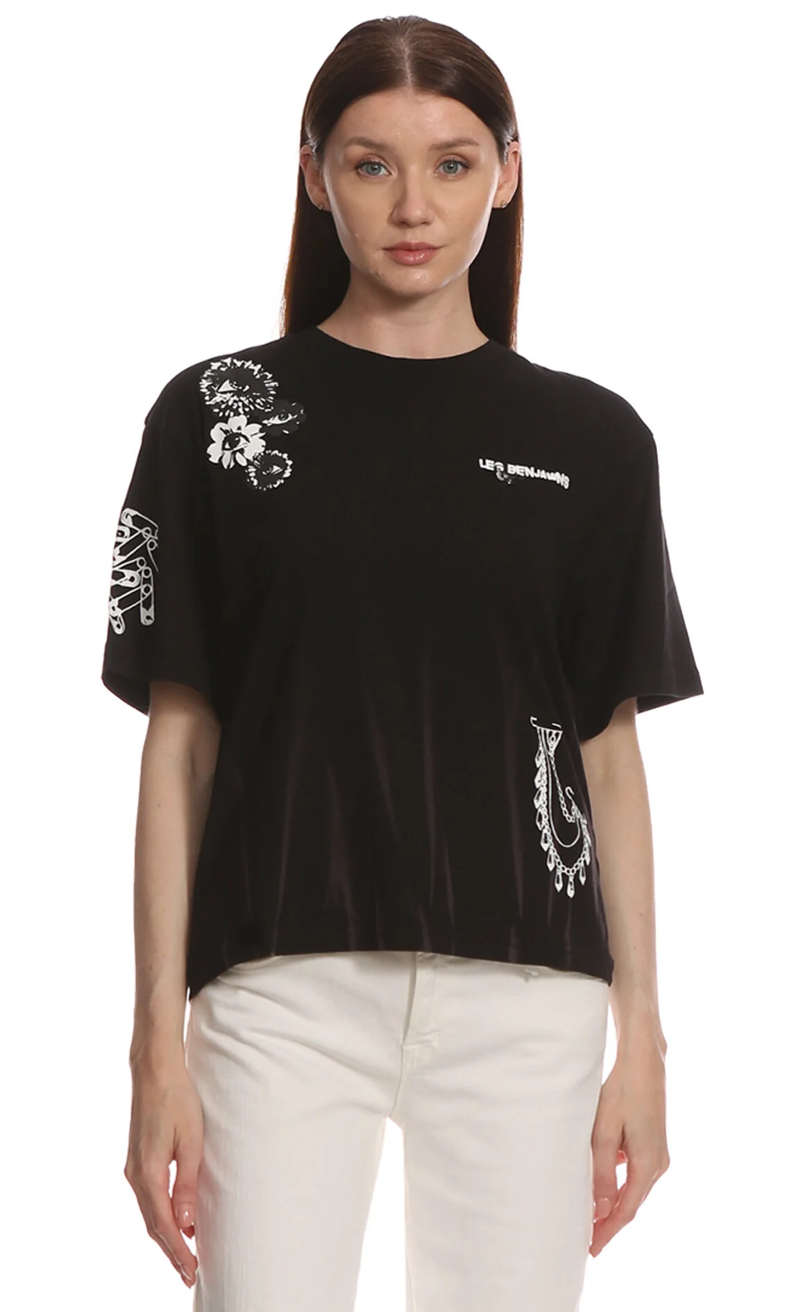 Les Benjamins Siyah Karışık Desenli Kısa Kollu Bisiklet Yaka Pamuk Kadın T-Shirt