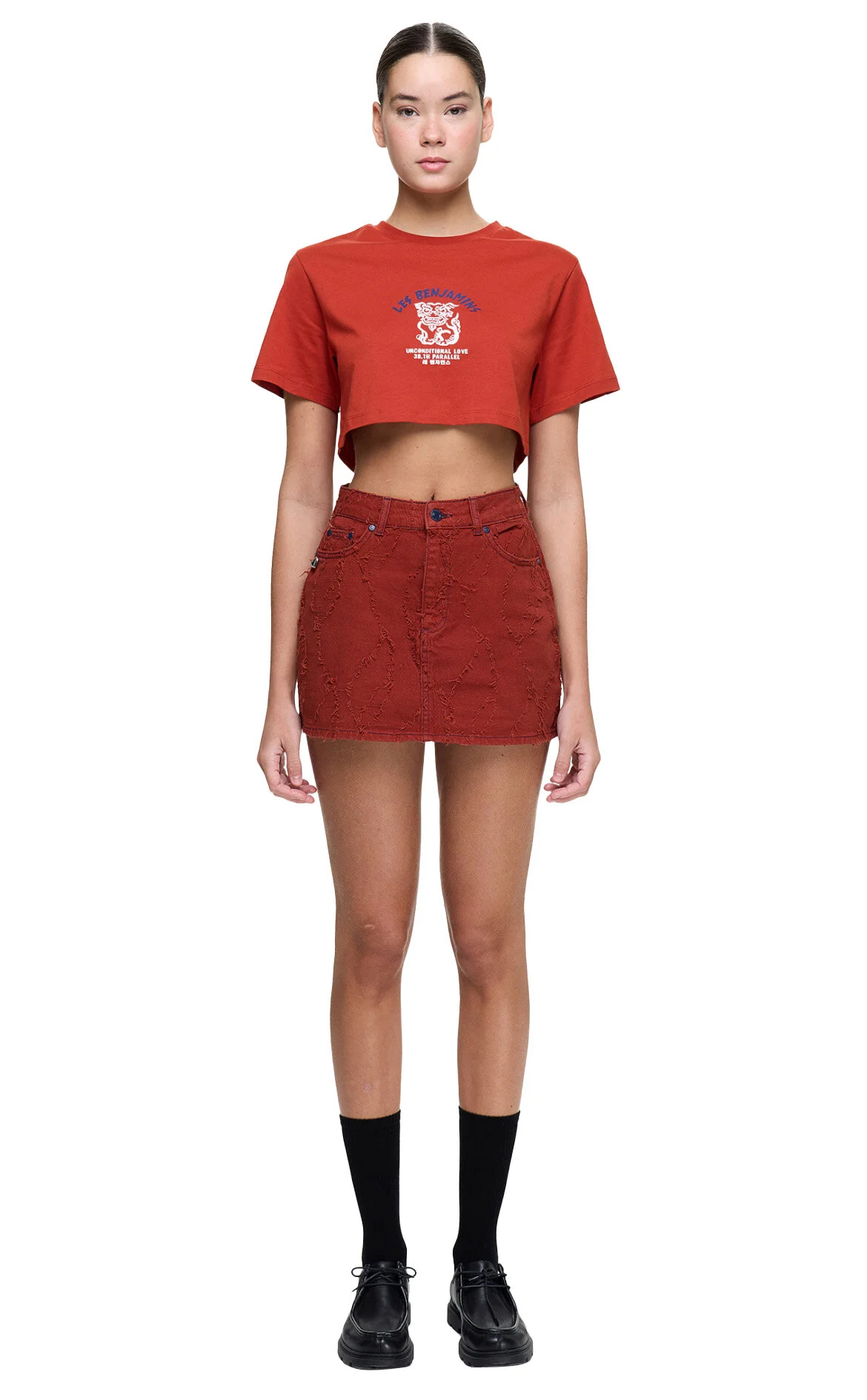 Les Benjamins Kırmızı Karışık Desenli Kısa Kollu Bisiklet Yaka Pamuk Kadın T-Shirt