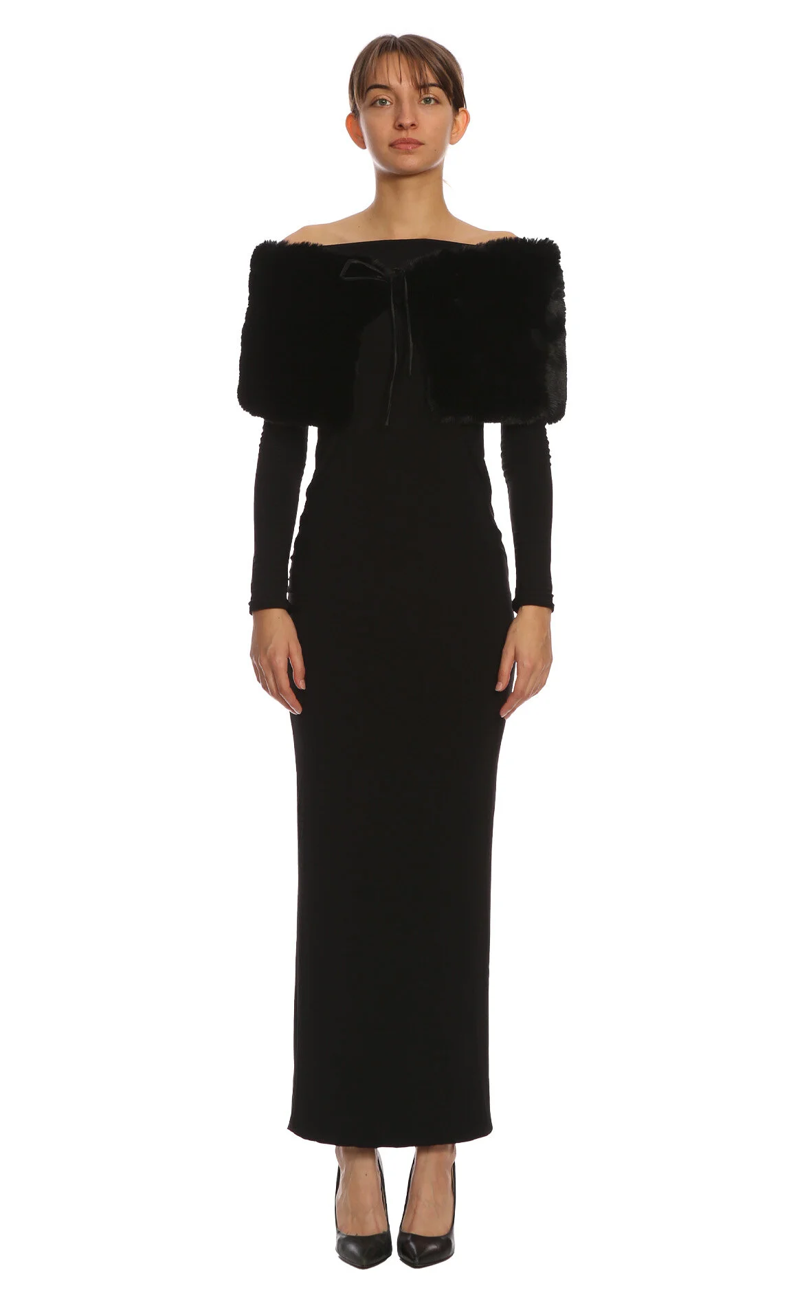 Luna B Siyah Uzun Kol Straplez Yaka Maksi Boy Elbise