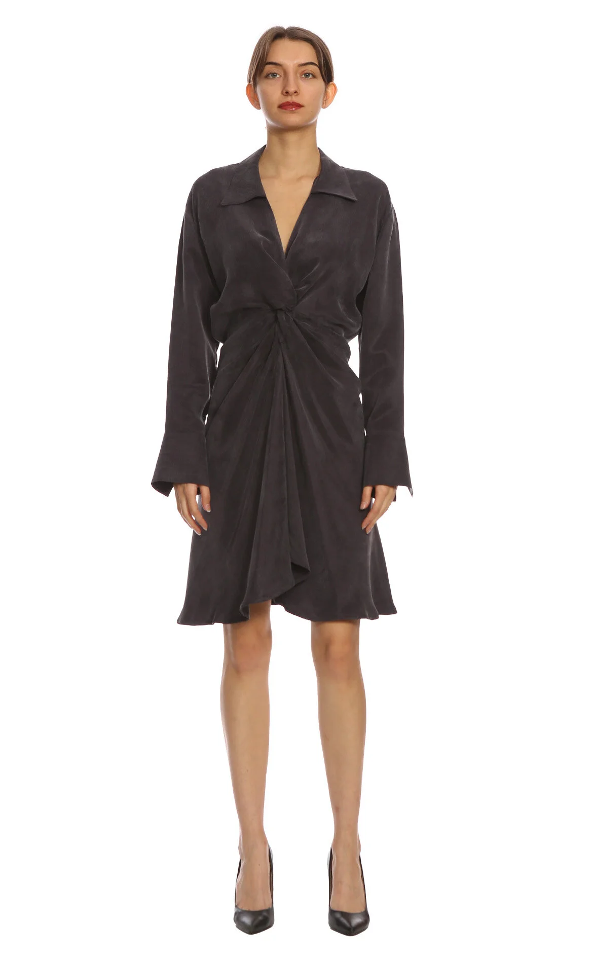Marais Studio Antrasit Rengi Uzun Kol V Yaka Mini Boy Elbise