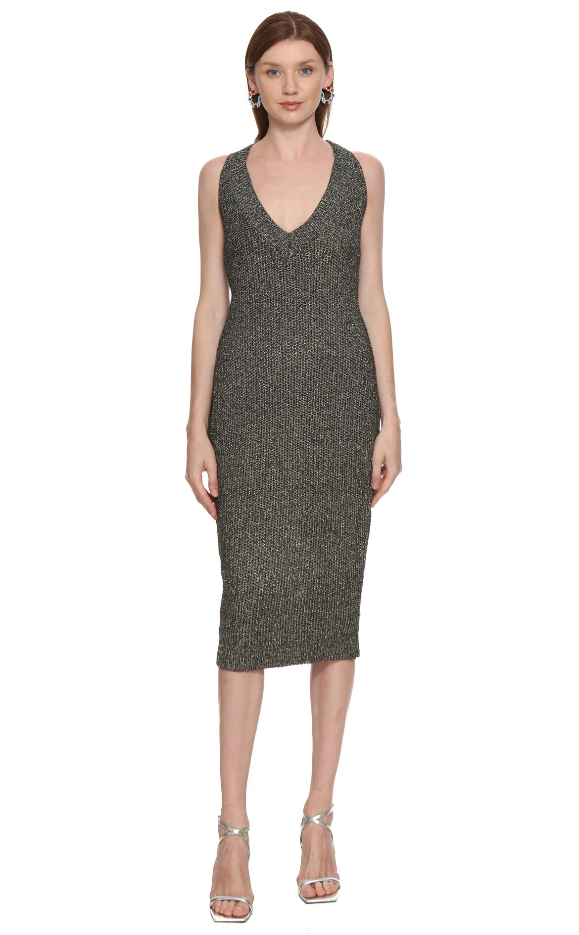 Misha Siyah Simli Askılı V Yaka Midi Boy Elbise