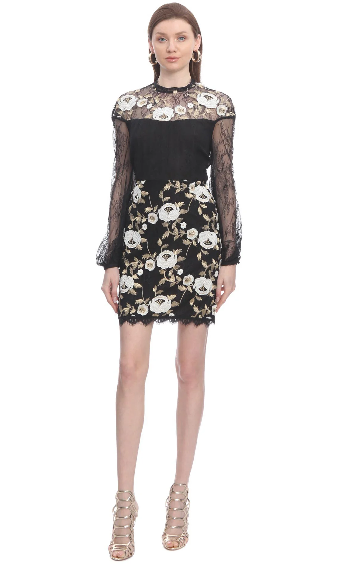 Misha Siyah Çiçek Desenli Uzun Kol Sıfır Yaka Mini Boy Elbise