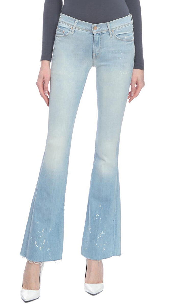 Düşük belli, ispanyol paçalı, cepli, taşlama desenli, mavi Mother jean pantolon