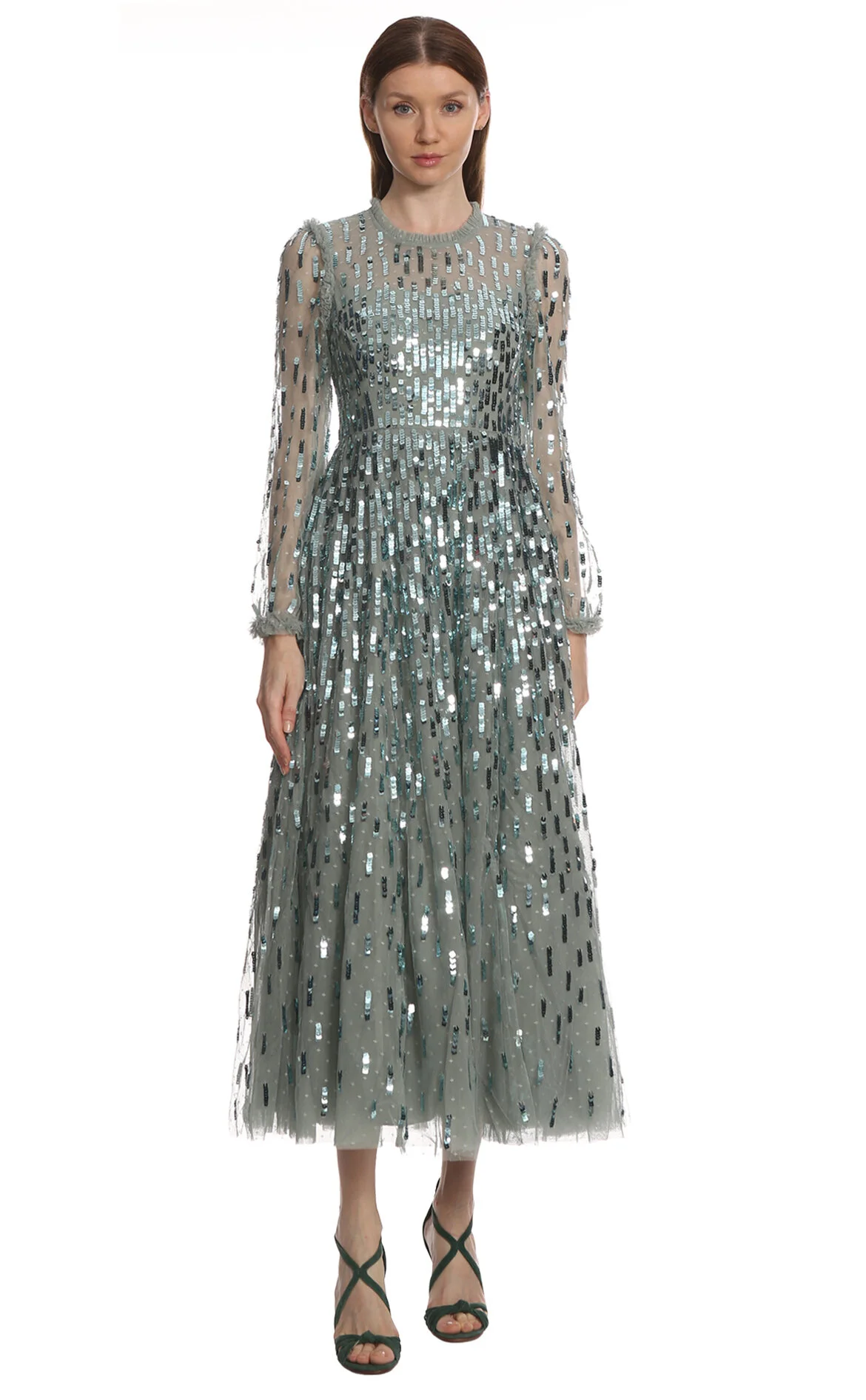 Needle&Thread Su Yeşili Pul Payetli Uzun Kol Yuvarlak Yaka Pamuklu Maksi Boy Elbise