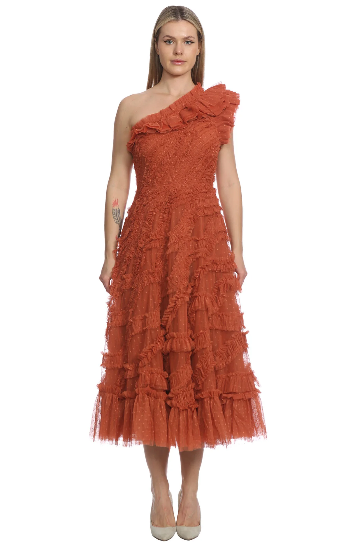 Needle&Thread Kahverengi Pul Payetli Tek Omuz Asimetrik Yaka Midi Boy Elbise