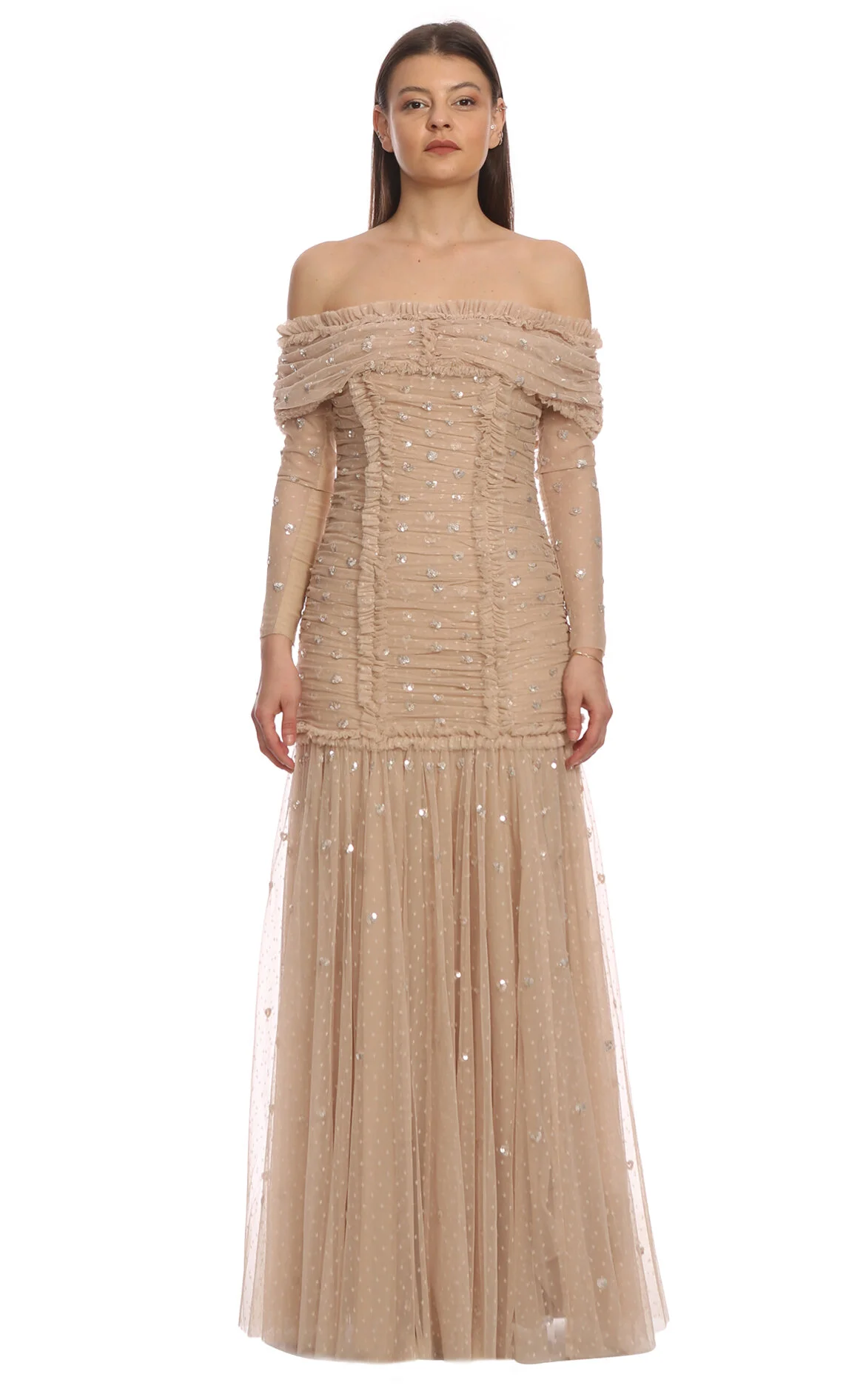 Needle&Thread Bej Pul Payetli Uzun Kol Straplez Yaka Maksi Boy Elbise