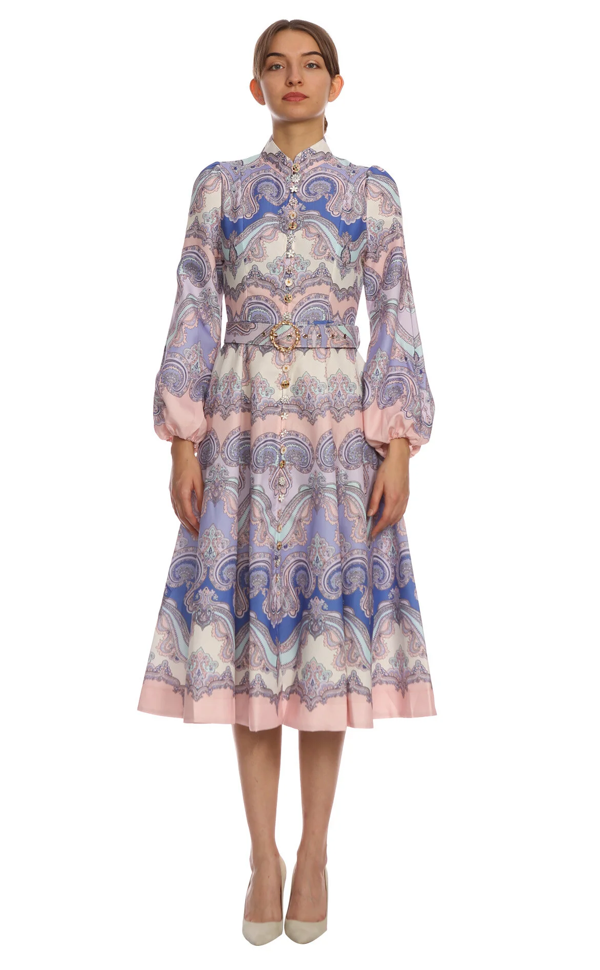 5. Çok Renkli Çiçek Desenli Uzun Kol Dik Yaka Maksi Boy Elbise