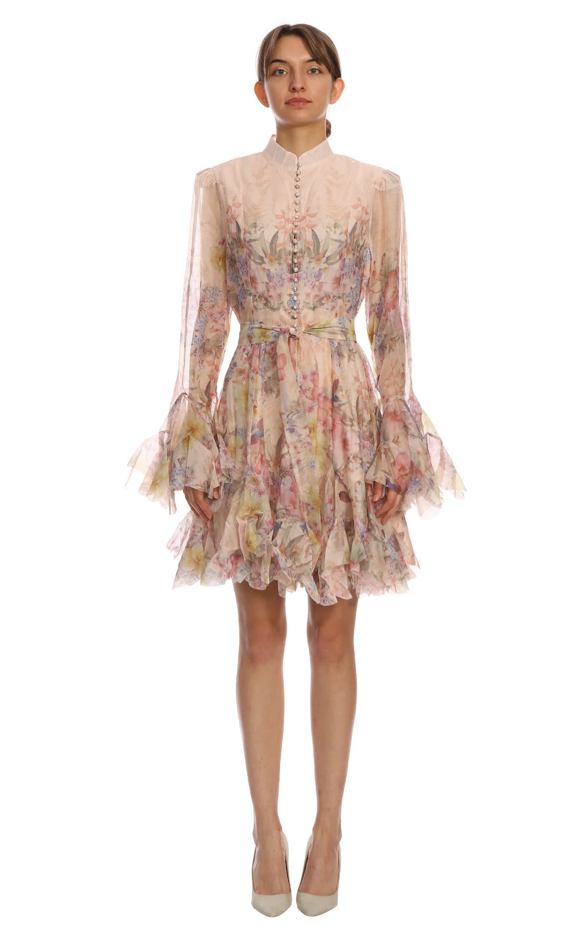 Nevada Love Çok Renkli Karışık Desenli Uzun Kol Hakim Yaka Şifon Mini Boy Elbise