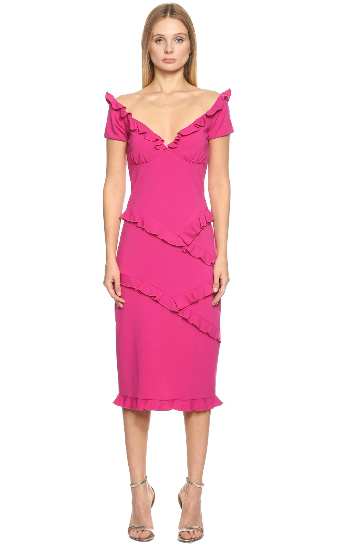 Nicole Miller Fuşya Kısa Kollu V Yaka Midi Boy Elbise