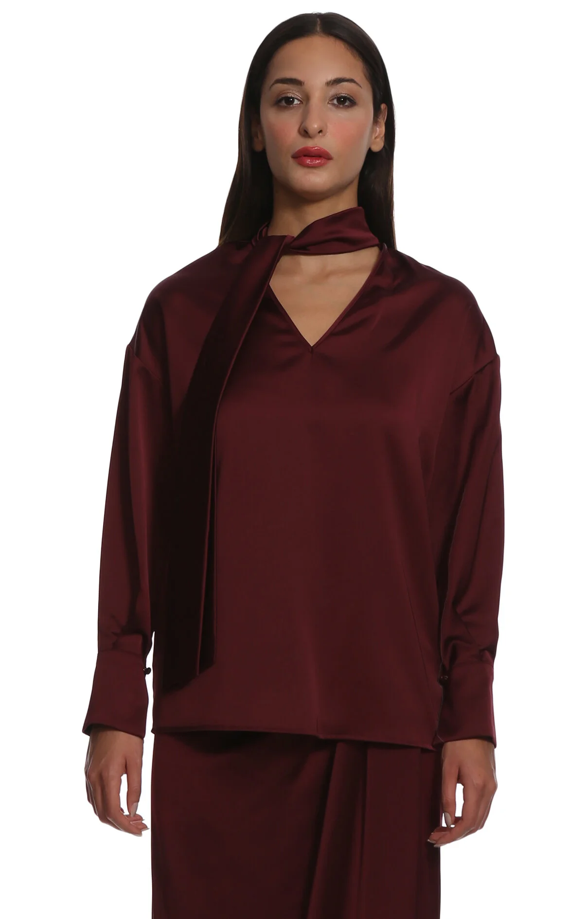 Penny Black Bordo Fular Detaylı Uzun Kol V Yaka Bluz