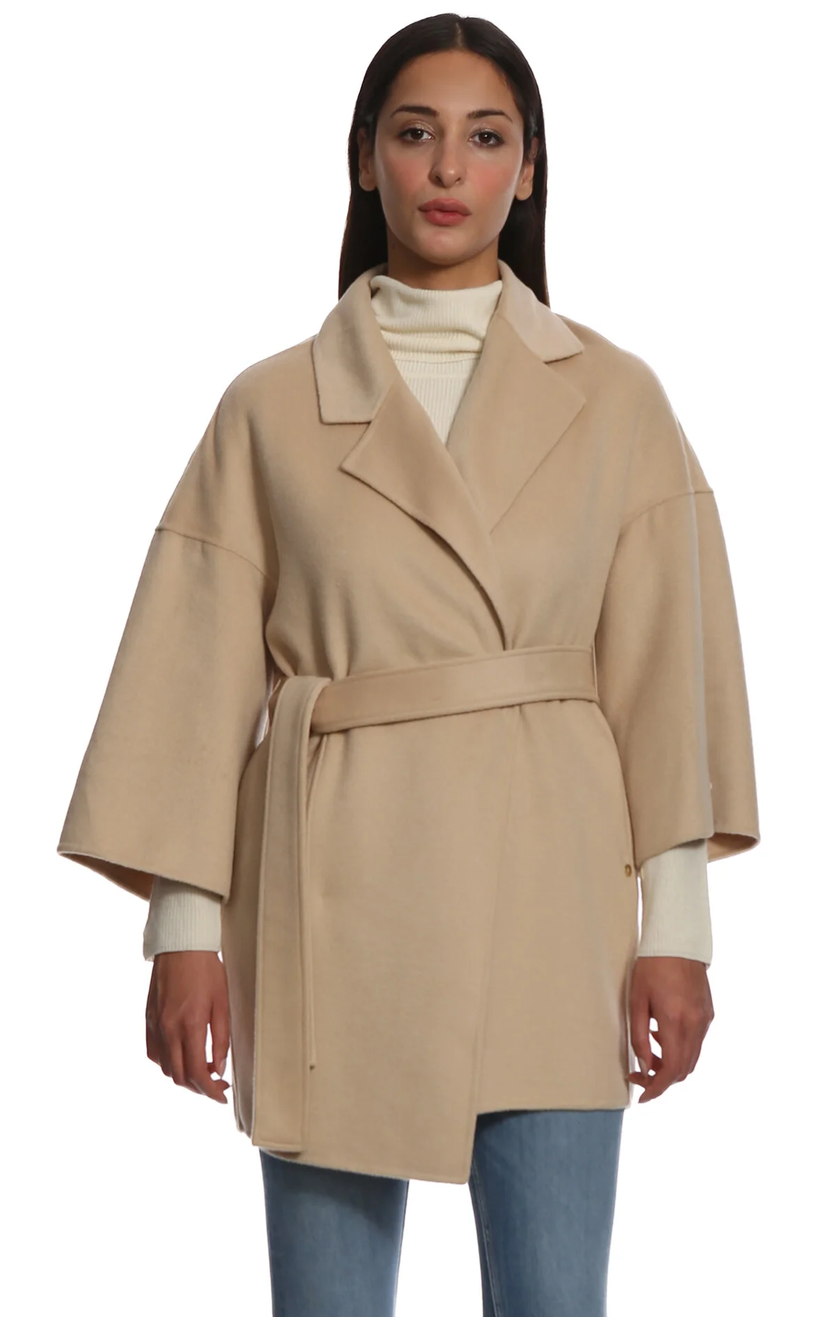 3. Bej Kemer Detaylı Uzun Kollu Kruvaze Yakalı Yünlü Kaban