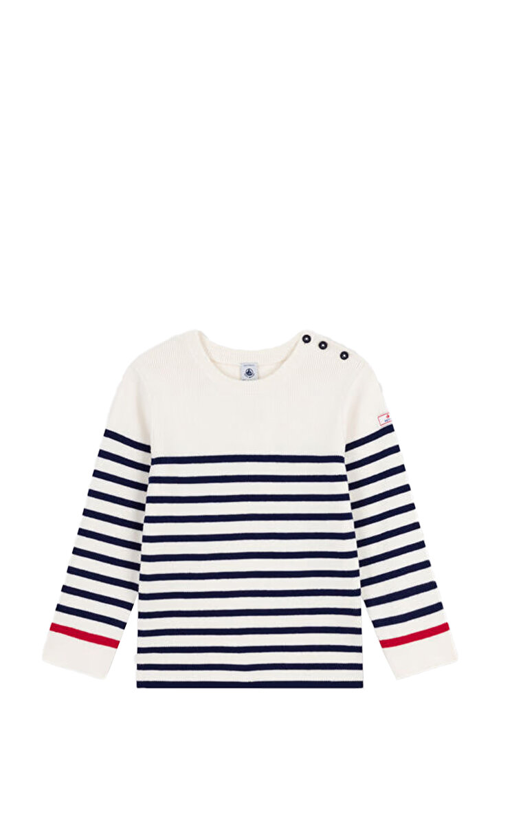 Çizgili, unisex, denizci yaka çocuk kazak. Kış için yumuşak ve sıcak tutan yünlü örme kumaştan, düz kesimde üretilmiştir. Omuzdan düğmeli, yuvarlak yaka ve kol uçlarında ribana bitişe sahiptir. Sol omuzda vintage tarzı dokuma etiket bulunur. Bu giysiyi örmek için hayvan refahına saygılı, yüksek kaliteli bir yün kullanılmıştır.